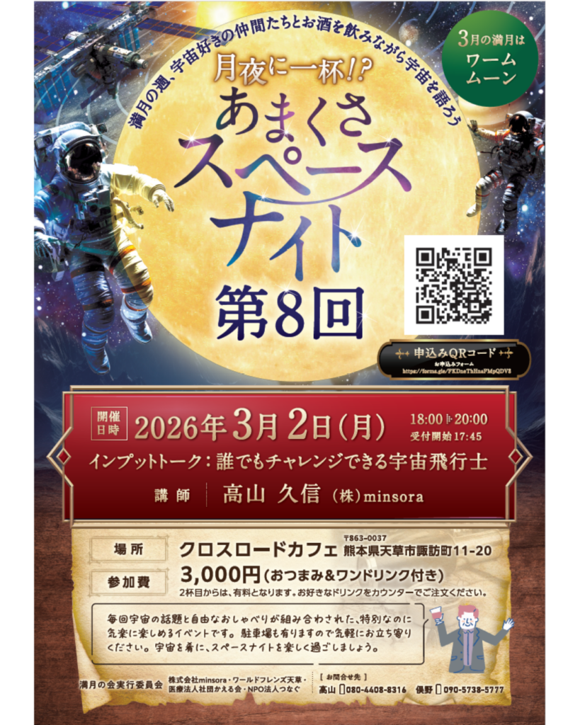 このイベントは、天草市に拠点を置く宇宙関連企業「株式会社minsora」と地元企業の「住宅とつながるクリニック天草」「ワールドフレンズ天草」が中心となる「満月の会実行委員会」が開催するものです。天草で宇宙をキーワードに、宇宙を身近に感じながら交流する場として開催します。ご参加をお待ちしています。