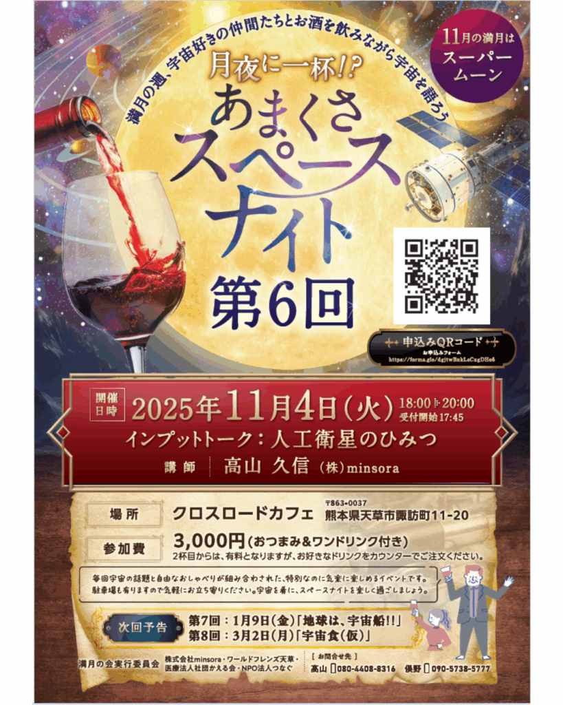 このイベントは、天草市に拠点を置く宇宙関連企業「株式会社minsora」と地元企業の「住宅とつながるクリニック天草」「ワールドフレンズ天草」が中心となる「満月の会実行委員会」が開催するものです。天草で宇宙をキーワードに、宇宙を身近に感じながら交流する場として開催します。ご参加をお待ちしています。